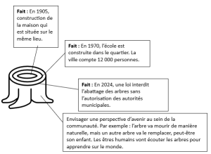 Cette activité amène les personnes apprenantes à construire leur interprétation de l’histoire à partir de la perspective de l’arbre au fil du temps.