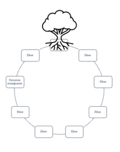- Ensuite, formez un cercle dont l’arbre fait partie intégrante. Cela permet d’inclure l’arbre dans la discussion et de le situer comme être vivant pouvant contribuer à la construction de notre vision du monde.