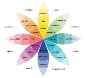 Les émotions sont organisées en huit catégories principales (la colère et la peur; le dégout et la confiance; la joie et la tristesse; l’anticipation et la surprise). Les émotions varient en intensité : celles proches du centre sont plus fortes et celles en périphérie de la roue sont plus légères.