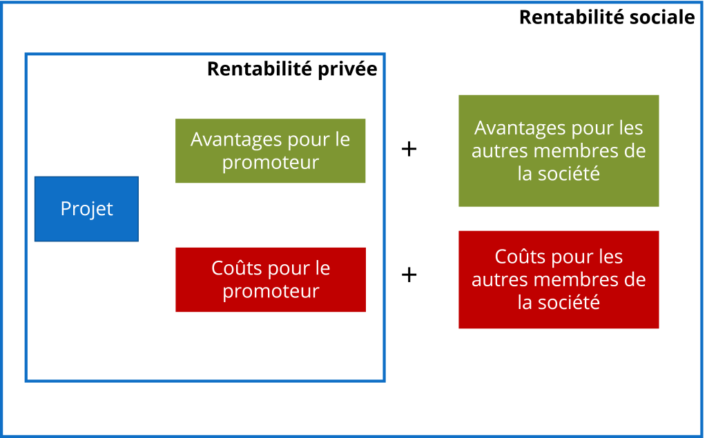 La Figure 1.1 met en évidence la distinction entre la rentabilité privée et sociale d’un projet lorsque le promoteur est membre de la société de référence, ce qui implique l’inclusion de ses coûts et avantages dans l’analyse de rentabilité sociale. En revanche, si le promoteur n’est pas affilié à cette société de référence, ses coûts et avantages ne devraient pas être pris en compte dans l’ACA. Par exemple, une ACA nationale ne devrait pas inclure les bénéfices réalisés par un promoteur étranger. Le chapitre 2 explorera en détail la question de la délimitation de la société de référence.