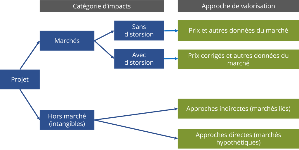Comme l’indique la Figure 1.2, les impacts sociaux d’un projet peuvent se matérialiser sur des marchés (avec ou sans distorsion) ou hors marché.