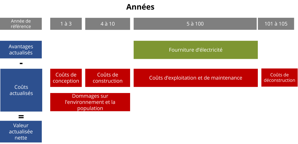 Il arrive souvent qu’un projet engendre des coûts et des avantages durant plusieurs années. Comme le montre la Figure 1.3, la construction d’un barrage prend plusieurs années et procure ensuite de l’électricité pendant plusieurs décennies. De même les investissements pour l’aménagement du sentier de motoneige serviront durant plusieurs années. Comme un dollar n’aura pas dans dix ans la même valeur qu’il a aujourd’hui, il est nécessaire de « convertir » toutes les valeurs en dollars d’une période de référence. Dans l’exemple du barrage, si l’ACA est effectuée en 2023, la période de référence choisie sera certainement l’année 2023, et tous les coûts et les avantages seront exprimés en dollar de 2023. Cette conversion de valeurs dans le temps se fait par l’actualisation, soit l’application de formules dont le paramètre principal est le taux d’actualisation social. La différence entre la somme des avantages et les coûts en dollars de l’année de référence correspond à la valeur actualisée nette ou VAN. Elle permet de déterminer si le projet est socialement rentable ou non. Le chapitre 6 présentera en détails les principes de l’actualisation et les règles de décisions de l’ACA.