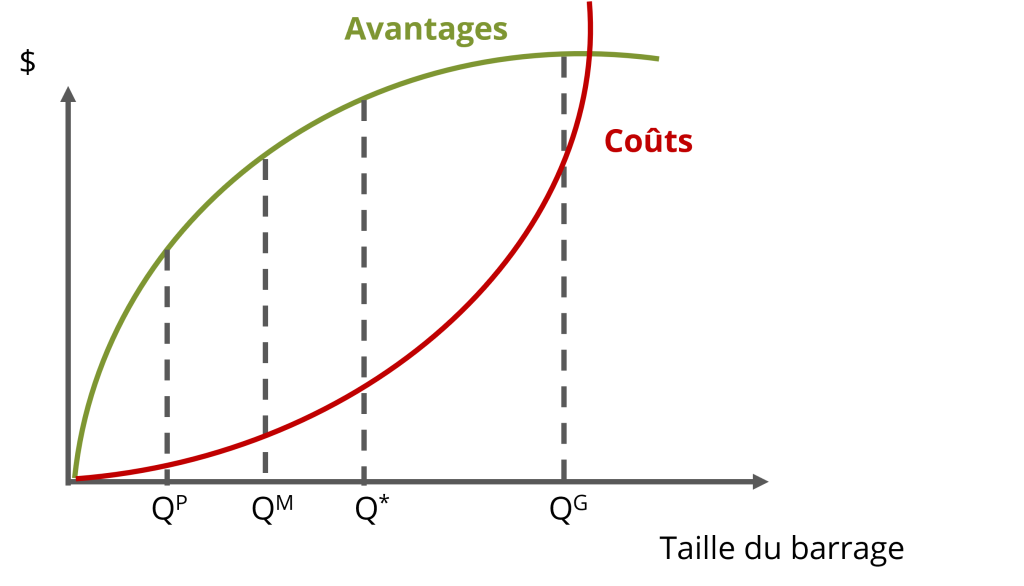 Dans notre exemple, il s’agit de déterminer le montant de la compensation minimale à verser aux motoneigistes pour qu’ils acceptent de renoncer au sentier ou la compensation à débourser aux résidents pour en accepter les nuisances.