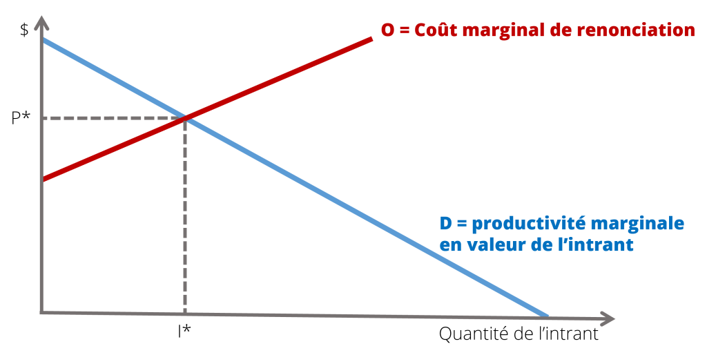 À l’équilibre concurrentiel sur le marché de l’intrant, le prix (ou le salaire) reflète donc simultanément la productivité marginale en valeur et le coût d’opportunité de l’intrant à la marge.