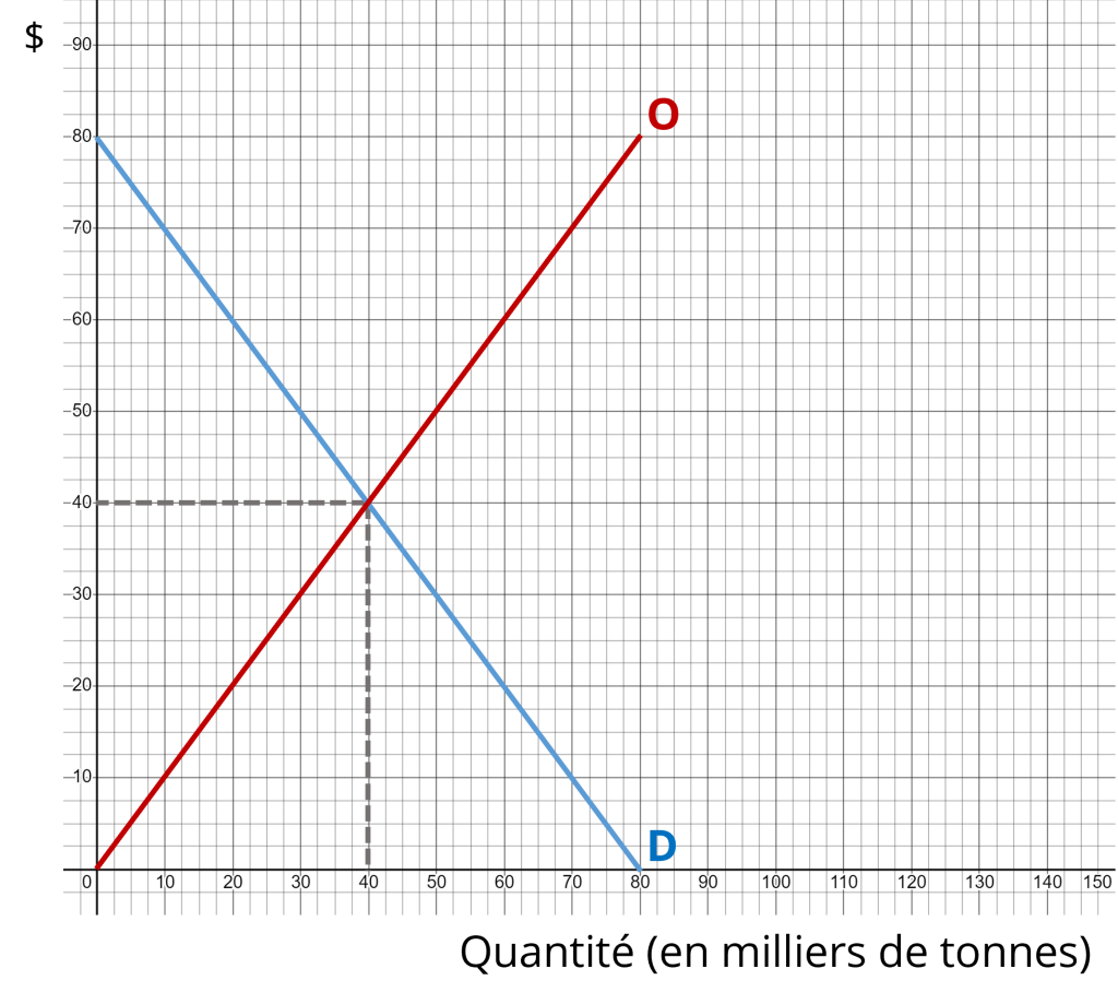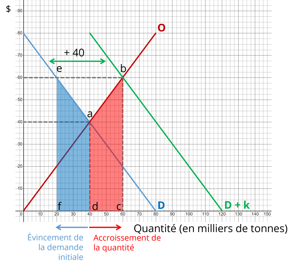 Le coût des unités d’intrants supplémentaires échangées sur le marché se quantifie par l’aire de la surface sous la courbe de l’offre, représentée par la zone abcd (ombrée en rouge) et correspondant à un montant de 1 million de dollars. Parallèlement, pour les unités d’intrants déplacées, le coût d’opportunité se mesure sous la courbe de la demande initiale, illustrée par la zone eadf (ombrée en bleu), également évaluée à 1 million de dollars. En effet, cette demande reflète la valeur que ces unités d’intrants génèrent dans leur utilisation initiale.