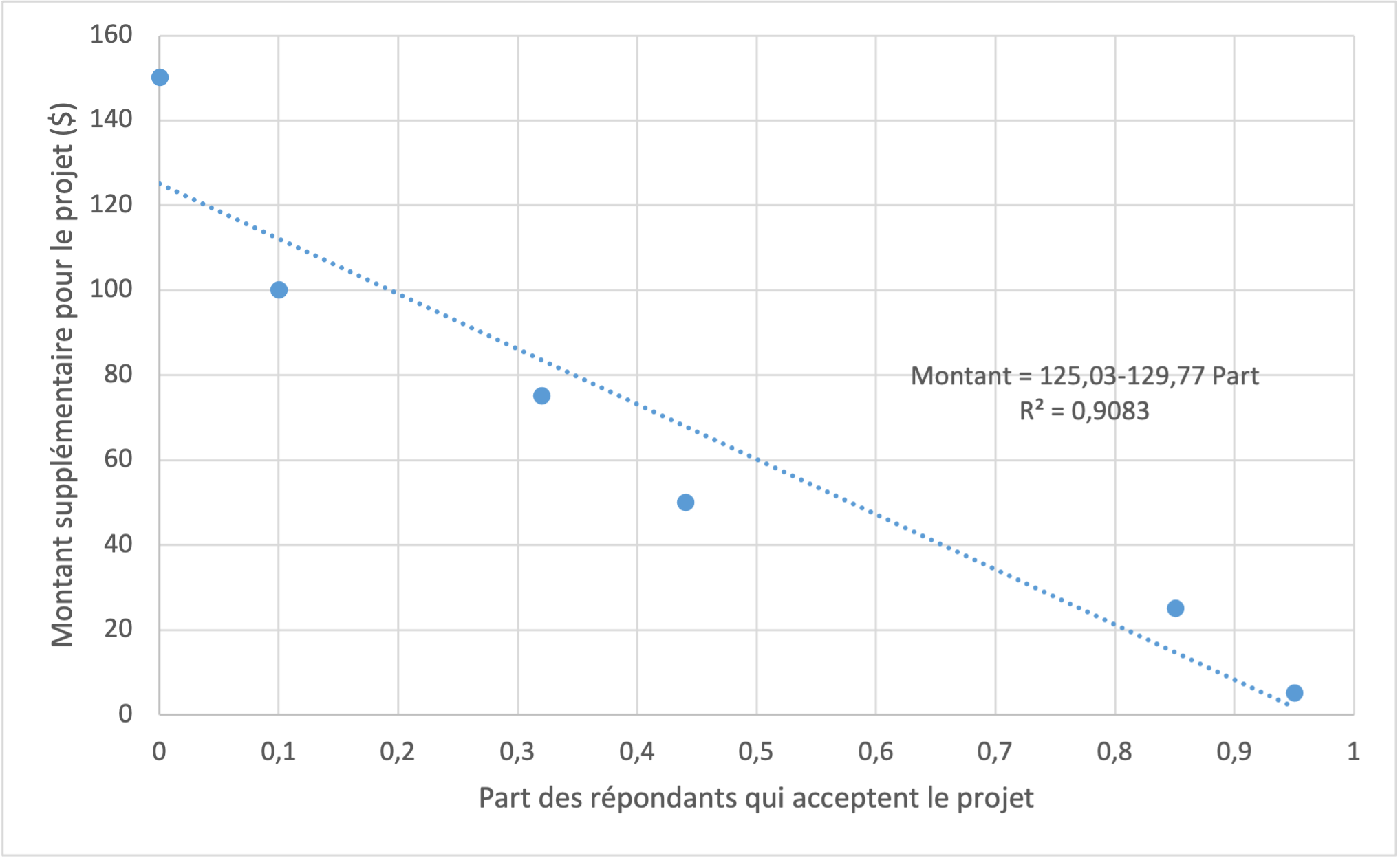 La Figure 15.1 offre un exemple d’un nuage de points résultant d’une question de type référendaire. Sur ce graphique, l’axe horizontal mesure la proportion des répondants qui acceptent l’offre, tandis que l’axe vertical représente le CAP proposé. Ainsi, pour un montant proposé de 100 $, 10 % des répondants acceptent la proposition. Cette figure présente également une droite de régression linéaire qui correspond à la courbe de la demande d’un répondant moyen. Toutefois, l’axe horizontal de cette droite mesure la probabilité d’acceptation du projet plutôt que la quantité. Néanmoins, malgré cette distinction, l’aire sous la courbe, approximativement de 60 $ par an, demeure une estimation du CAP moyen d’un répondant.