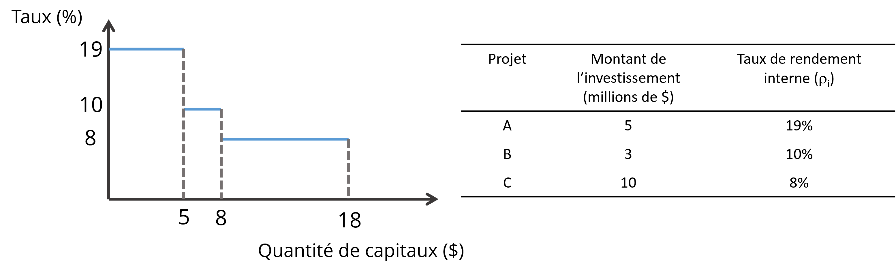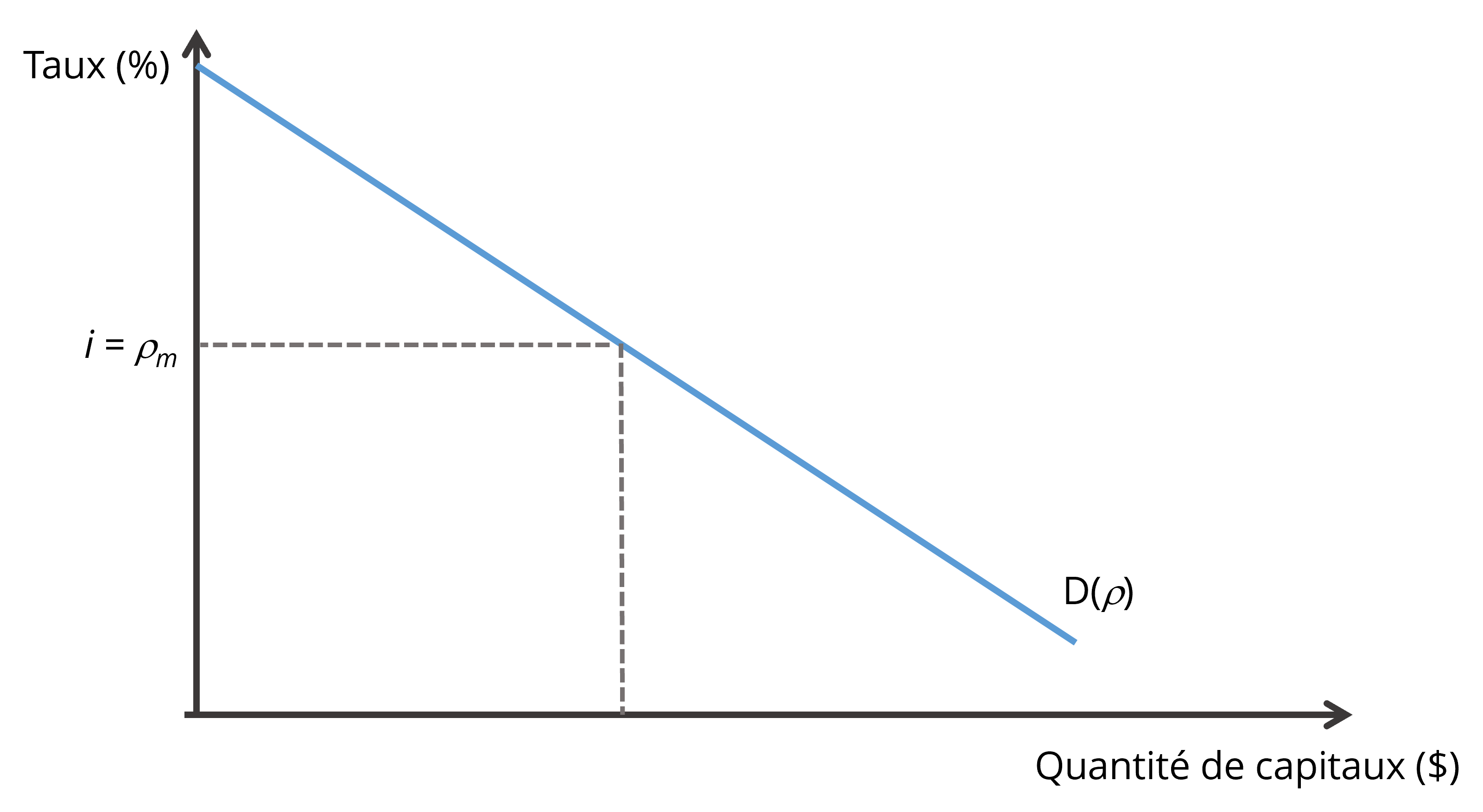 La demande de capitaux reflète l’arbitrage entre le taux de rendement interne des projets d’investissement et le taux d’intérêt sur le marché, c’est-à-dire le coût du financement des projets. Pour un taux d’intérêt donné, le projet d’investissement réalisé à la marge a donc un taux de rendement interne égal au taux d’intérêt.