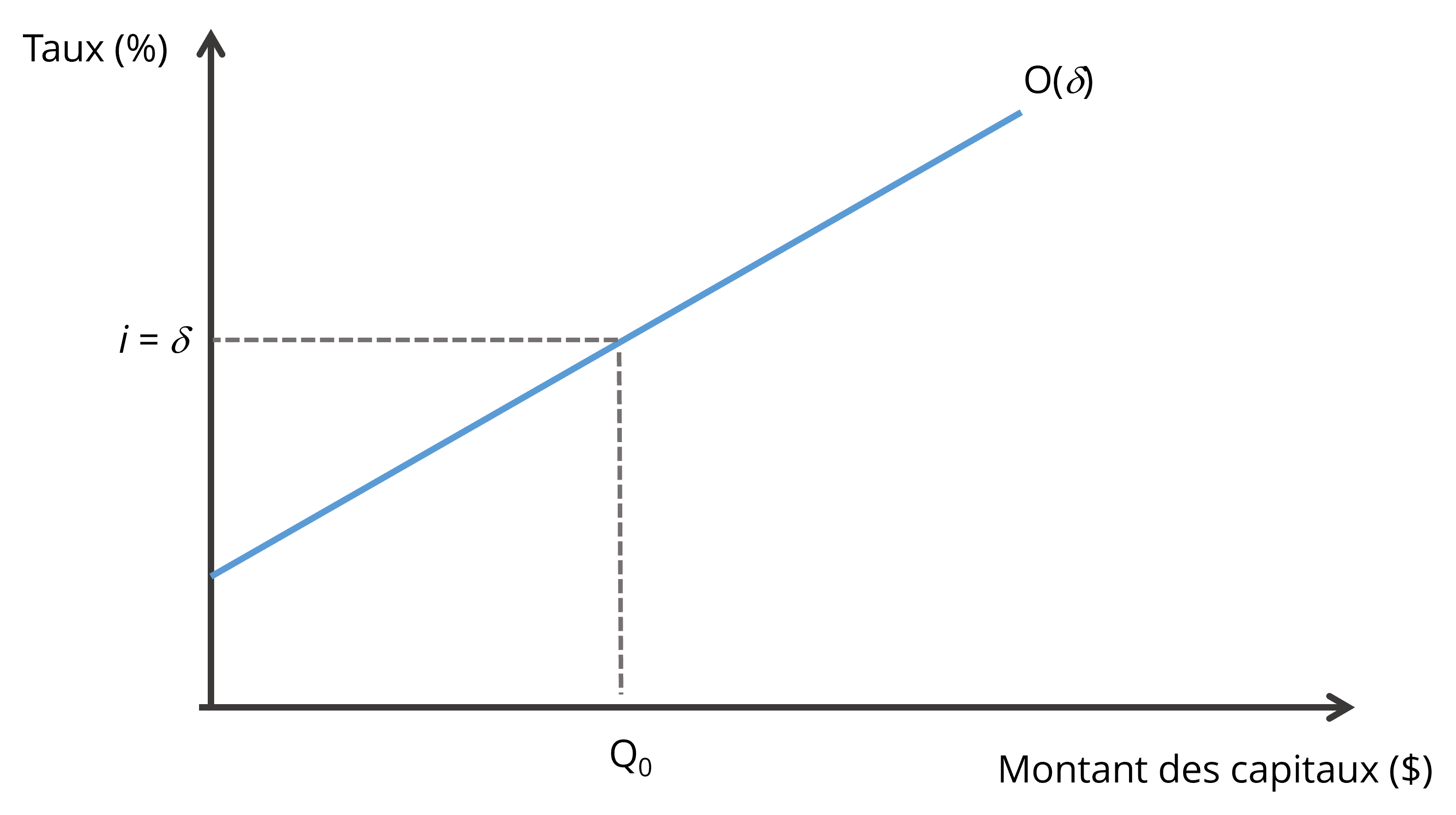 Si une personne présente un δ égal à 20 %, cela signifie qu’elle sera prête à consommer moins aujourd’hui si le montant ainsi épargné lui rapporte 20 % d’intérêt. Au niveau individuel, on s’attend à ce que δ augmente au fur et à mesure que le montant déjà épargné s’accroît. L’offre individuelle d’épargne augmente donc avec le taux d’intérêt. Par ailleurs, le taux de préférence intertemporel est variable au sein de la population. Cela entraîne également que la courbe de l’offre de capital augmente avec le taux d’intérêt, puisque plus le taux d’intérêt est élevé, plus de personnes épargneront. La Figure 17.3 illustre la courbe de l’offre de capitaux. Si le taux d’intérêt est de i %, la quantité de capitaux offerts est de Q0, et le taux de préférence intertemporel à la marge est égal à i %. L’épargnant à la marge sera donc indifférent à épargner ou à consommer davantage aujourd’hui.
