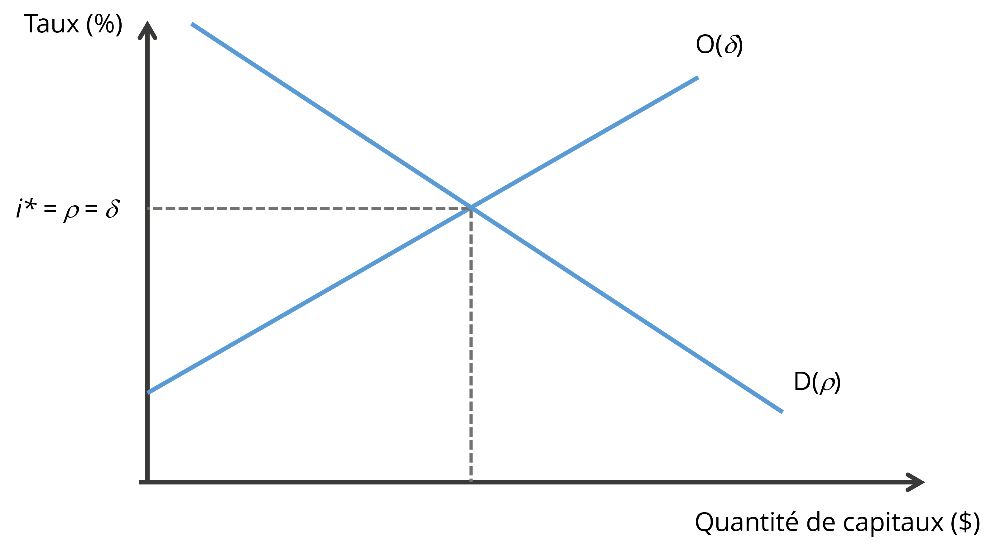Pour comprendre cette approche, il est utile de décrire brièvement le fonctionnement d’un marché des capitaux dans un contexte très simple : celui d’une économie fermée et sans distorsion. Cela implique qu’on ne constate ni entrée ni sortie de capitaux du pays, aucune taxe, aucun risque ni asymétrie de l’information. Dans ce monde idéal, la demande en capitaux reflète les décisions d’investissement des entreprises, tandis que l’offre traduit les décisions d’épargne des particuliers.