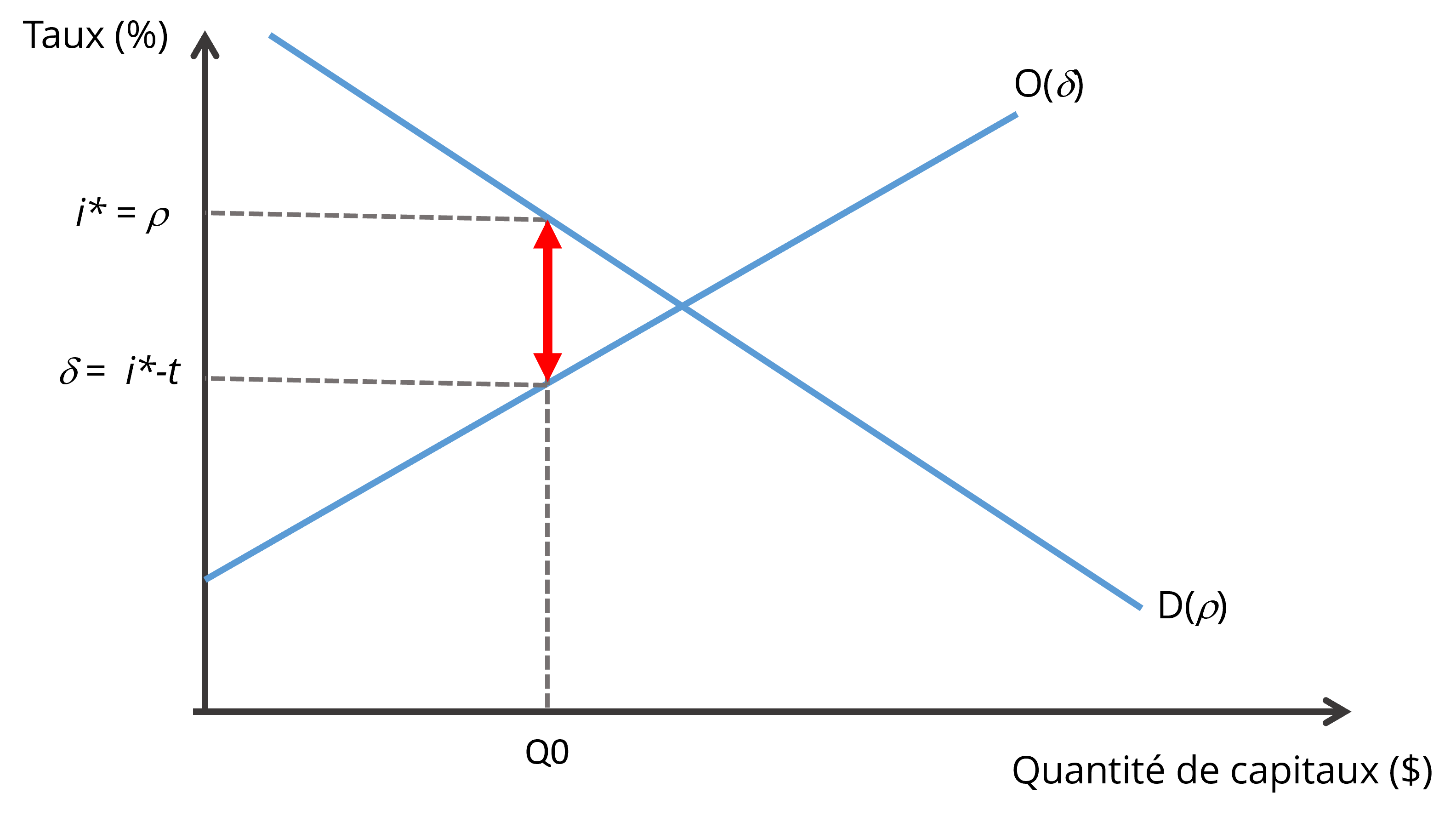 Comme c’est le cas pour d’autres marchés, celui des capitaux est affecté par des distorsions, ce qui fait varier le coût de renonciation des fonds investis dans un projet en fonction de leur provenance. On peut illustrer cela en supposant la présence d’une taxe sur l’épargne de t%. Comme mentionné précédemment, cette taxe engendre une disparité entre le taux payé par les demandeurs de capitaux et celui reçu par les individus qui les fournissent. Dans la Figure 17.5, le taux d’intérêt d’équilibre i* reflète le taux de rendement de l’investissement à la marge, mais il ne représente plus le taux de préférence intertemporel à la marge, puisque δ = i* – t.