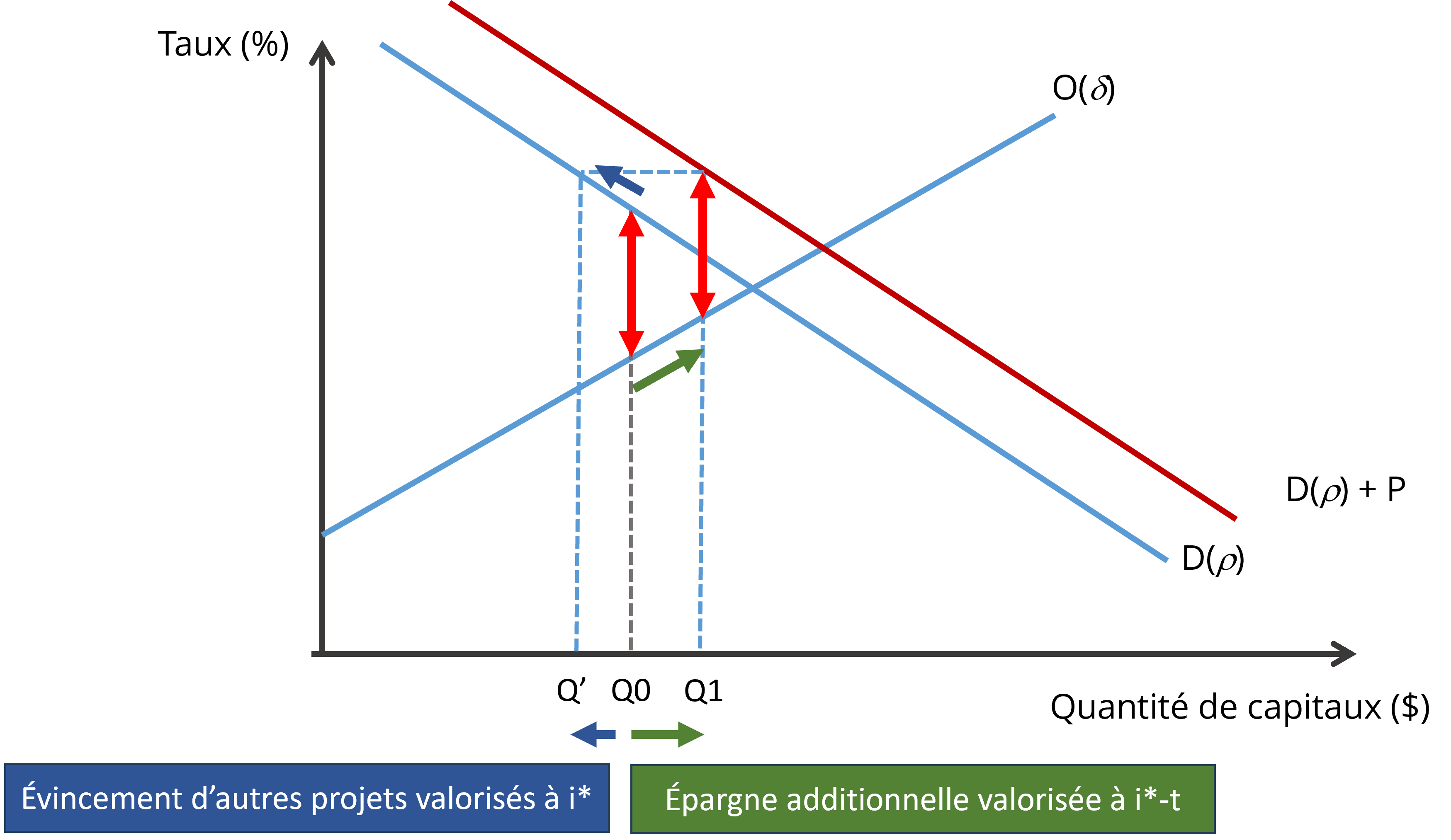 Un nouveau projet (P) entraîne un déplacement de la demande de capitaux vers la droite (voir la Figure 17.6). Une partie des capitaux du projet provient d’un évincement d’autres projets (entre Q’ et Q) et est valorisée au coût de renonciation i*. En revanche, la partie qui résulte d’un accroissement de l’épargne (entre Q0 et Q1) enregistre un coût de renonciation de i* – t. Il s’agit donc ici du même raisonnement que nous avons effectué pour d’autres intrants au chapitre 11.