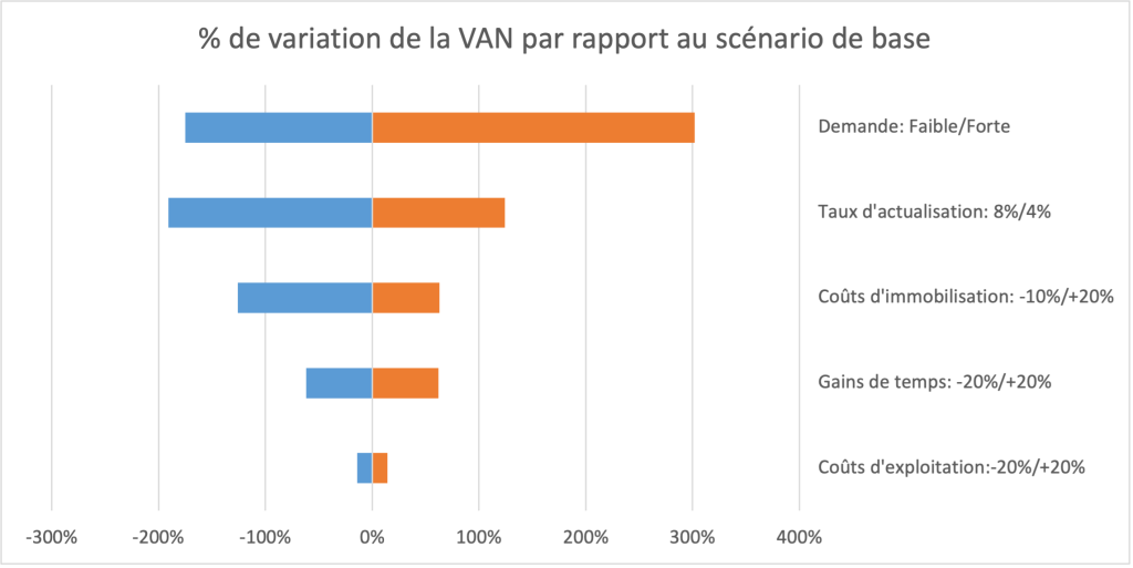 Le choix des valeurs des paramètres et des prévisions nécessaires pour réaliser une ACA comporte beaucoup d’incertitude. La prévision du nombre de traversées sur un horizon de 40 ans est un exercice incertain. Il est donc essentiel d’analyser les risques et d’évaluer comment la VAN change avec la valeur des paramètres et des prévisions. Trois types d’analyse de sensibilité peuvent être envisagés :