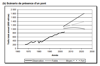 Dans l’ACA du pont, les auteurs ont passé en revue différents cas réels de projets comparables, ce qui leur a permis de conclure que le remplacement d’un système de traversiers par un pont entraîne en moyenne un accroissement des traversées de 18 % à 25 %.