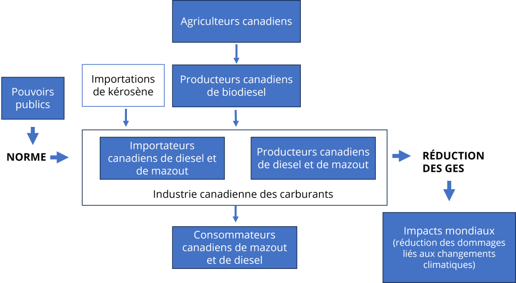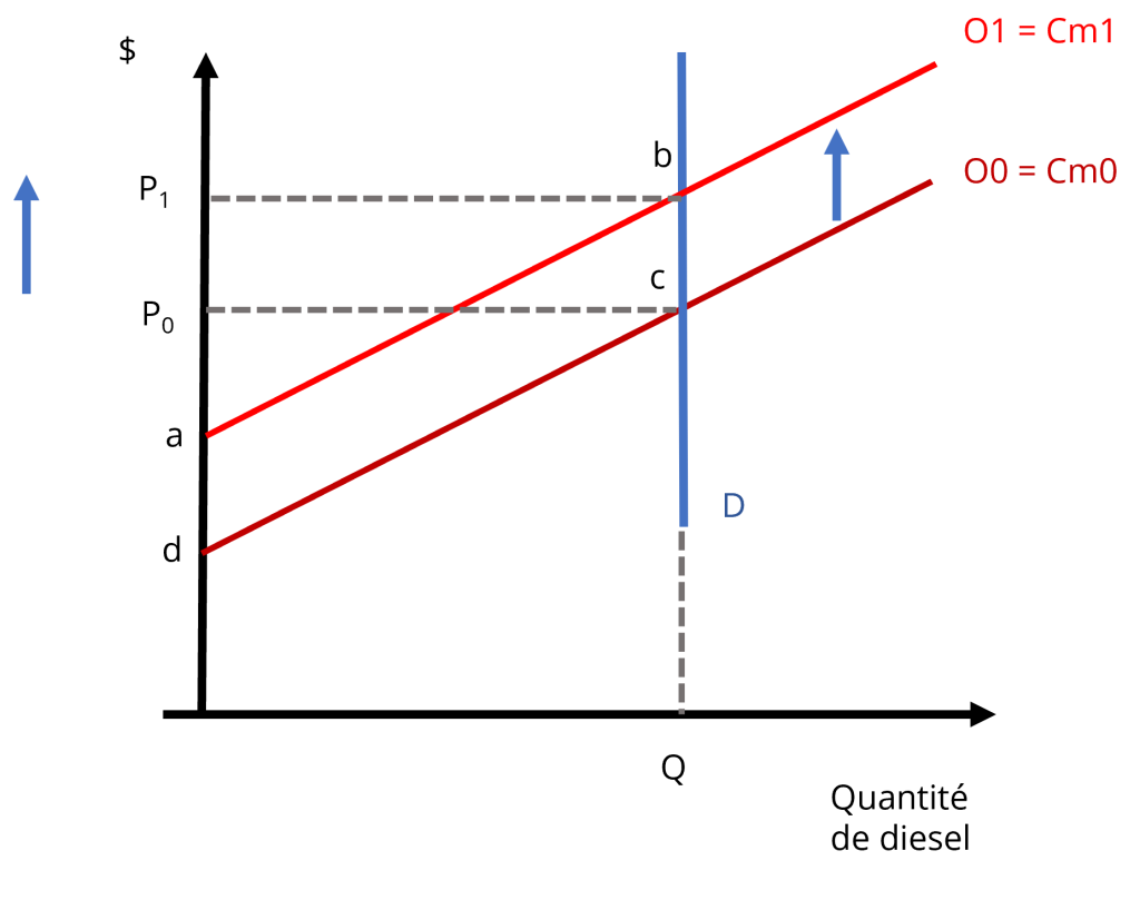 Sur le marché des carburants, l’imposition de la norme cause un impact direct sur la production et la vente de diesel. Pour simplifier la présentation, nous nous concentrerons sur le marché du diesel, mais l’analyse s’avérerait la même pour celui du mazout.
