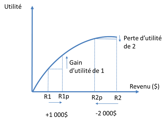 Imaginons un projet où l’individu 1 obtient un avantage de 1000 $, alors que l’individu 2 défrais un coût de 2000 $. C’est donc comme si le revenu de l’individu 1 passe de R1 à R1p sur le graphique ci-dessous, alors que celui de l’individu 2 passe de R2 à R2p. Cependant, l’individu 2 est plus riche que l’individu 1, de sorte que l’impact de cette perte de revenu de 2000 $ a un effet sur son bien-être qui est moindre que l’impact de 1000 $ sur le bien-être de l’individu 1. On voit sur le graphique que la perte d’utilité de 2 est plus que compensée par le gain d’utilité de 1. En se fondant sur une ACA, ce projet ne devrait pas être adopté, puisque A-C < 0. Par contre, ce projet améliore le bien-être total.