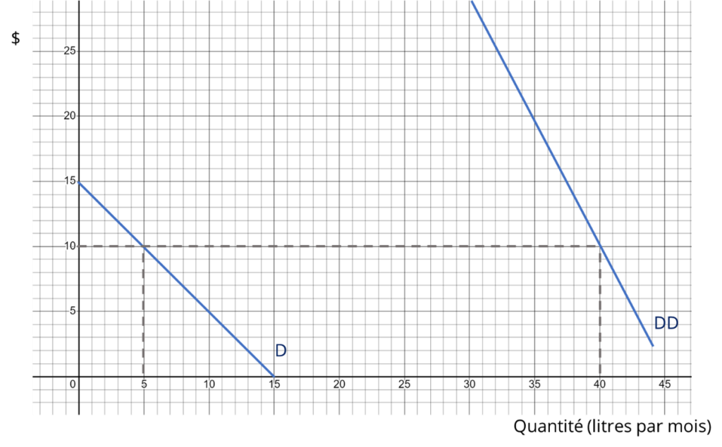 Un projet vise à lutter contre la dépendance à l’alcool. La demande type d’une personne dépendante est représentée à la Figure 8 par la courbe DD. La demande type pour une personne qui n’éprouve pas de dépendance est figurée par la courbe D. Le prix moyen de l’alcool est de 10 $ le litre. Discutez des enjeux liés à la valorisation des effets du projet du point de vue de la dépense et du surplus du consommateur