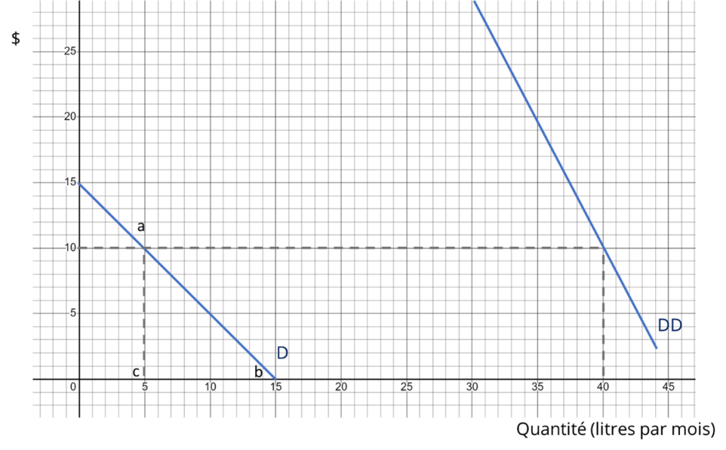 Une alternative consiste à utiliser la courbe de la demande D pour évaluer la perte d’avantages résultant de la réduction de la consommation. Ainsi, une diminution de la quantité consommée de 40 litres à 5 litres entraînerait une réduction des avantages correspondant à l’aire du triangle abc, soit 50 $ par mois. Par conséquent, l’effet net deviendrait positif, avec un gain net de 300 $ par mois.