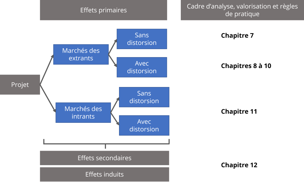 Comme l’illustre la Figure 1, les chapitres 7 à 10 se concentrent plus spécifiquement sur le cadre d’analyse, la valorisation et les règles de pratique des extrants d’un projet dans un marché primaire. Dans le chapitre 7, nous examinons ces questions dans le cadre d’un marché concurrentiel sans distorsion. Le chapitre 8 étudie la valorisation des extrants en présence de taxes ou de subventions ainsi que la conception d’un cadre d’analyse pour évaluer les impacts d’un projet modifiant les coûts dans une industrie. Le chapitre 9 aborde la prise en compte des effets externes dans la valorisation des résultats d’un projet, alors que le chapitre 10 se penche sur les conséquences d’autres sources de distorsions, telles que le pouvoir de marché, l’asymétrie de l’information et les biais cognitifs.