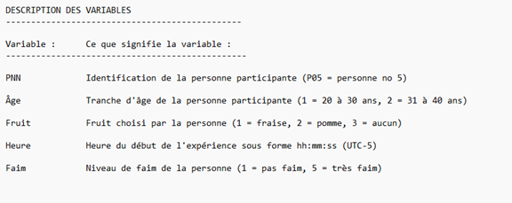 - Les noms des variables (nom utilisé et nom compréhensible au besoin)