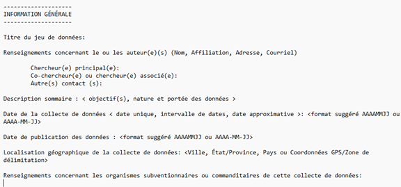 Un fichier LISEZ-MOI (README) fournit des informations à propos d’un fichier ou d’un jeu de données. Il permet d’assurer la pérennité de l’interprétation correcte des données par toutes les personnes qui les consulteront. Dans la mesure où un jeu de données est téléchargé à partir d’un dépôt, il permet également d’informer les utilisatrices et utilisateurs de son origine afin que les données soient comprises et citées correctement.
