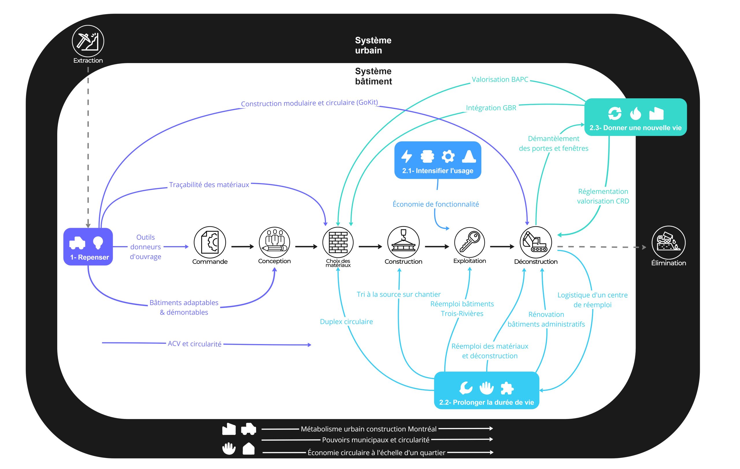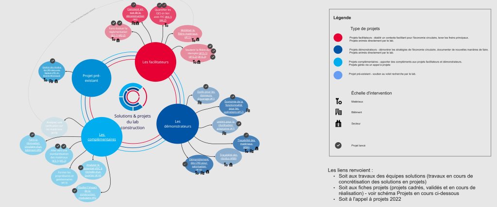 Figure 11 : Schéma de la circularité appliquée au secteur de la construction et les 19 projets du Lab construction