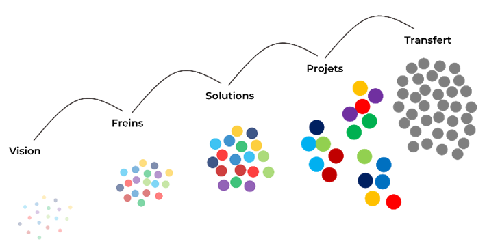 • Certaines catégories (« Les facilitateurs » et « Les démonstrateurs ») ont mobilisé les parties prenantes par équipes dites « solution ». Ces équipes ont travaillé en cocréation à l’émergence de projets.