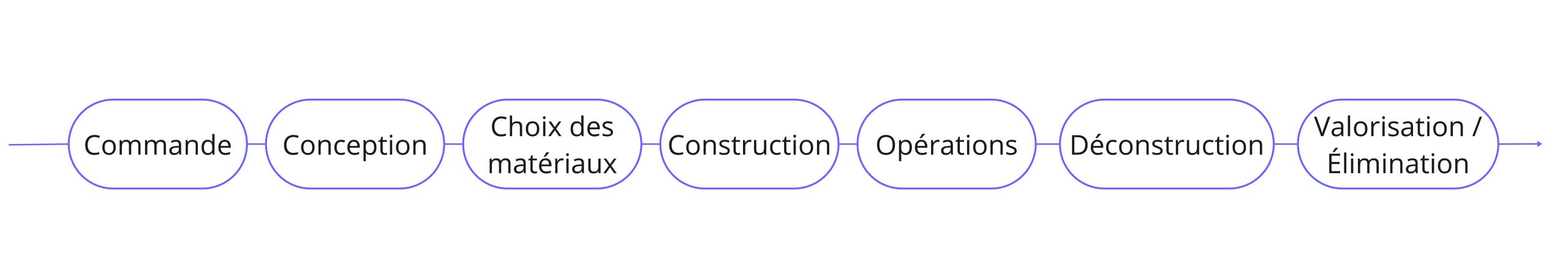 Le Lab construction s’est initialement concentré principalement sur le bâtiment (laissant de côté les infrastructures) — ainsi les travaux se sont d’abord appliqués à ce périmètre. Le point de départ des travaux a été la liste des étapes de la chaîne de valeur d’un bâtiment. Une chaîne de valeur est l’ensemble des activités créatrices de valeur réalisées par plusieurs organisations, depuis la commande ou la conception d’un produit ou d’un service jusqu’à sa fin de vie. La figure 5 présente les différents maillons de la chaîne de valeur d’un bâtiment à partir de la commande jusqu’à la fin de vie.