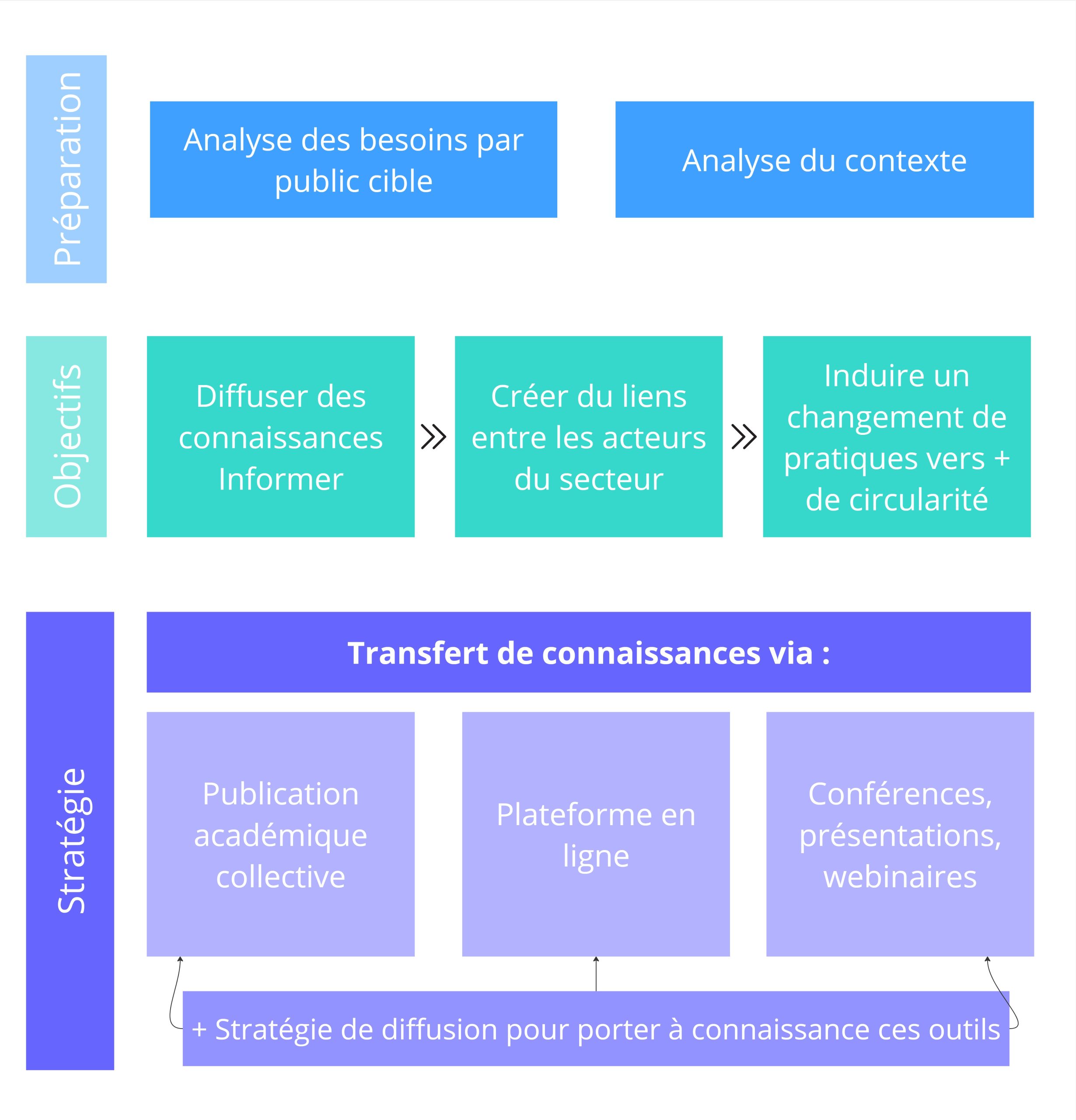 Elle s’intègre à la stratégie de transfert de connaissances du Lab construction, lequel est décrit au Chapitre II. Cette stratégie de transfert de connaissances a été développée en cocréation avec les publics cibles : les donneurs d'ouvrage, les décideurs, les entrepreneurs généraux et spécialisés, fonctionnaires et élus municipaux, les ingénieurs et architectes, la communauté scientifique et le monde académique, les entreprises du réemploi et de la gestion des CRD. Elle est basée sur trois piliers majeurs (voir Figure 1), soit :