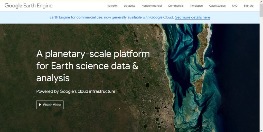 • que l’on y trouve des archives massives de données de télédétection, notamment sur les capteurs des programmes Landsat, Sentinel et MODIS, sur l’élévation, sur les données climatiques, sur la couverture végétale, sur données vectorielles thématiques et topographiques, et bien d’autres données;