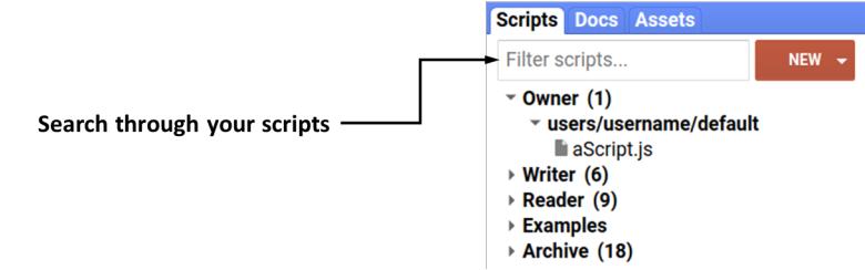Vous devez utiliser l’onglet « Scripts » (Figure 3) dans le panneau de gauche pour gérer vos codes sous Google Earth Engine.