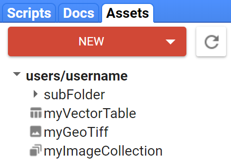 Pour télécharger et gérer des ensembles de données géospatiales, utilisez le gestionnaire de ressources dans l’éditeur de code. Le gestionnaire d’actifs se trouve dans l’onglet « Assets », sur le côté gauche de l’éditeur de code (Figure 52).