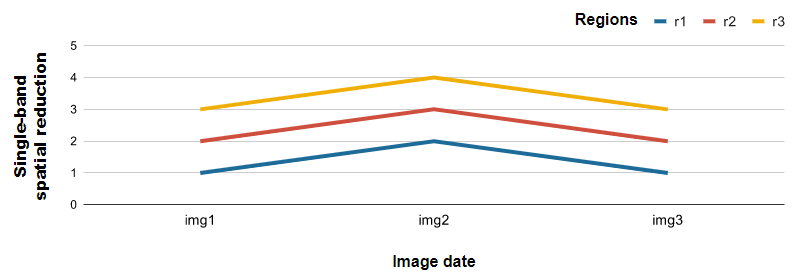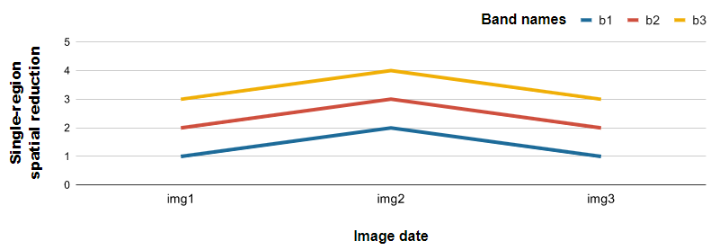 Avec cette méthode, la date de l’image est tracée sur l’axe des x en fonction de la propriété system:time_start. Les bandes d’images définissent les séries. Les valeurs de l’axe des Y sont la réduction des images, par date, pour une seule région. La figure ci-dessous présente un résultat pour une série d’images avec les statistiques pour les bandes b1, b2 et b3 (Figure 78).