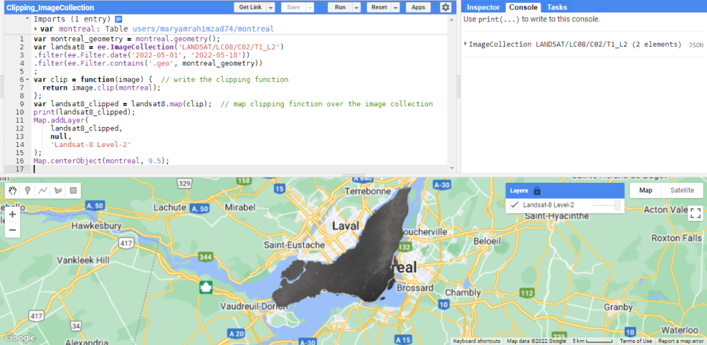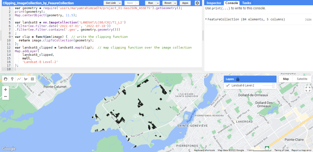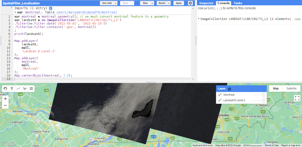 var landsat8 = ee.ImageCollection(‘LANDSAT/LC08/C02/T1_L2’).filter(ee.Filter.date(‘2021-01-01’, ‘2022-01-01’)).filter(ee.Filter.contains(‘.geo’, montreal.geometry()))