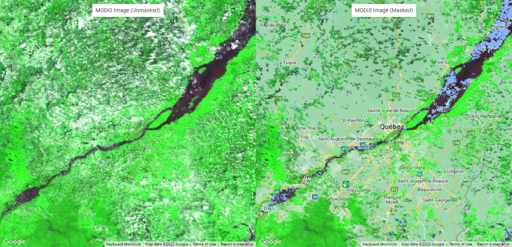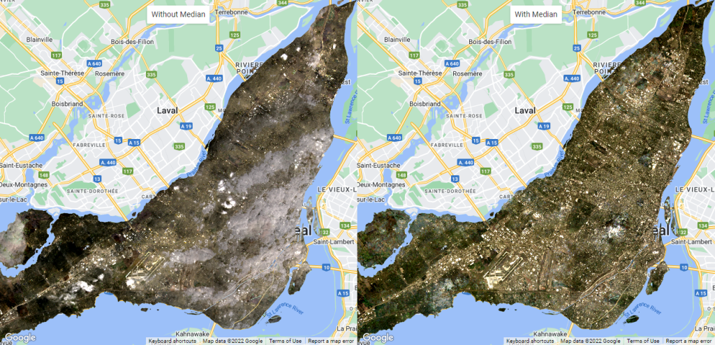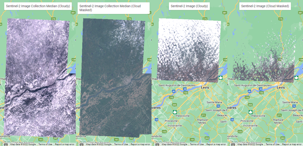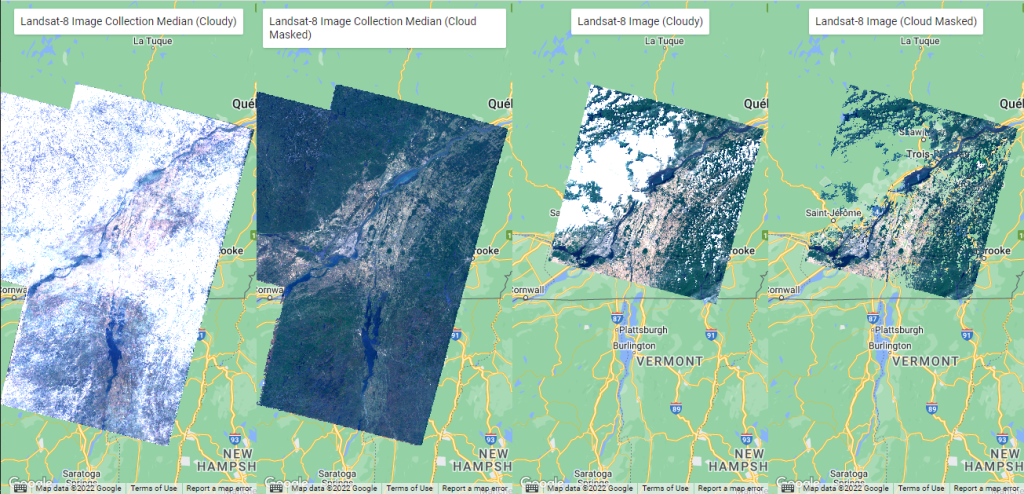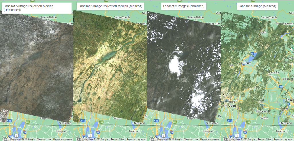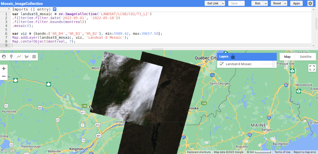 L’exemple ci-dessous montre un mosaïque d’images Landsat-8 sur la région de Montréal entre les 1er et 18 mai 2022 (Figure 45). Comme vous pouvez l’observer, les images Landsat sont sujettes à la couverture nuageuse et la création d’une mosaïque ave GEE n’est pas garante d’une image 100% dégagée. C’est pourquoi nous verrons dans les prochaines sections, les méthodes à privilégier pour appliquer certains filtres spécifiques afin d’optimiser les images utilisées pour la mosaïque.