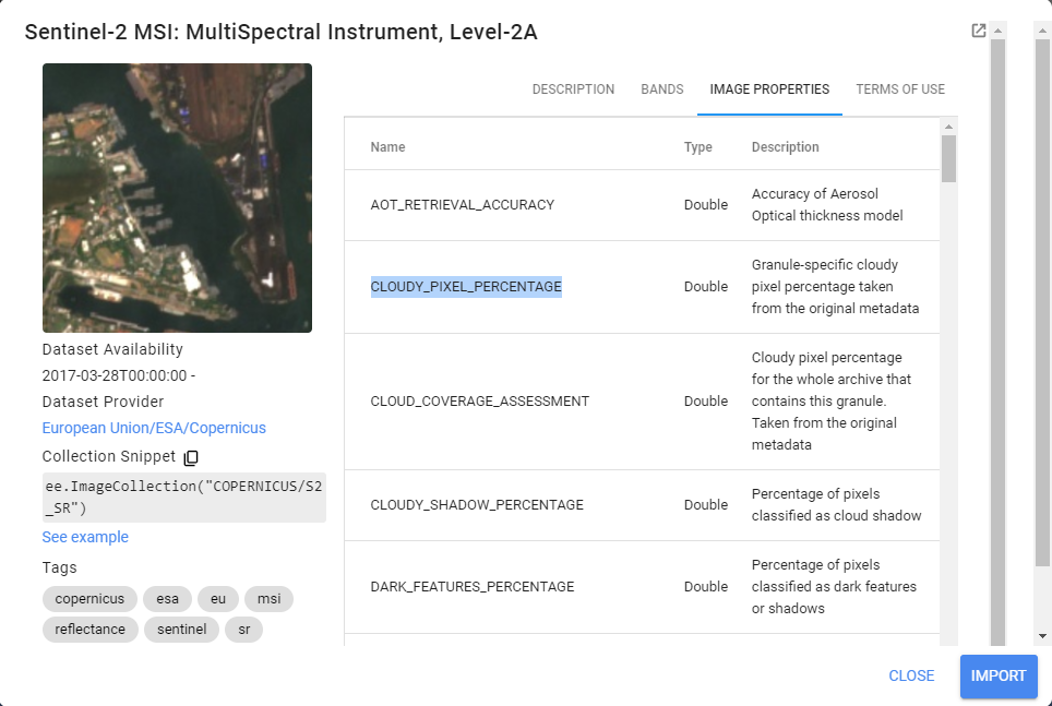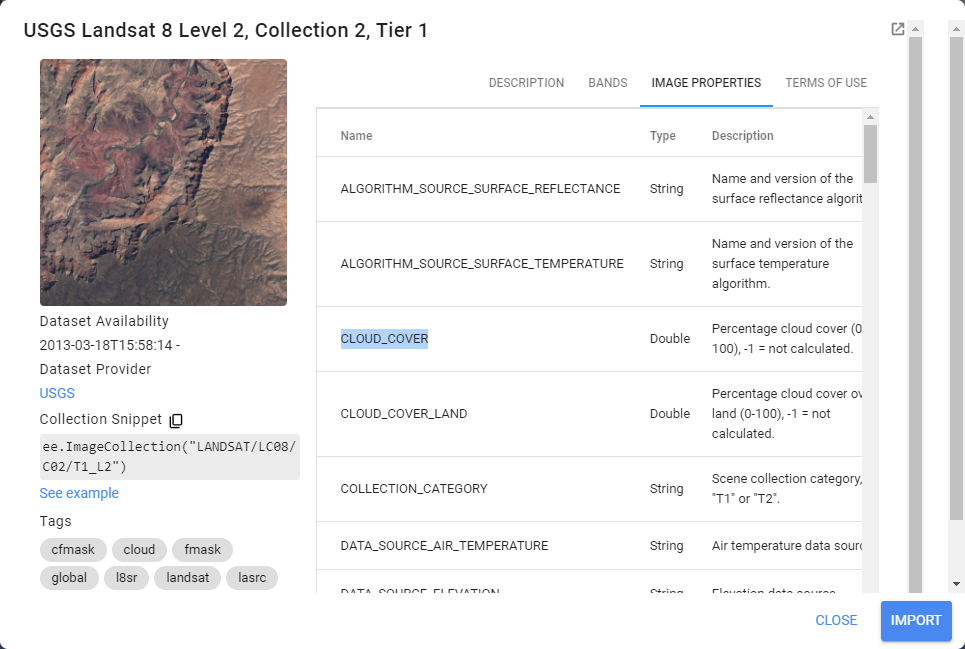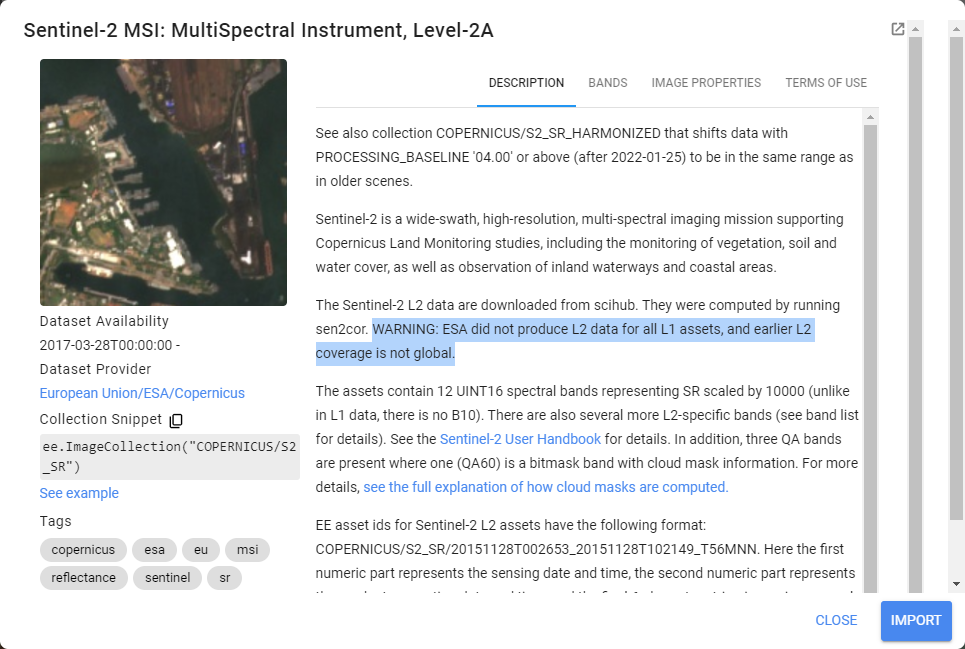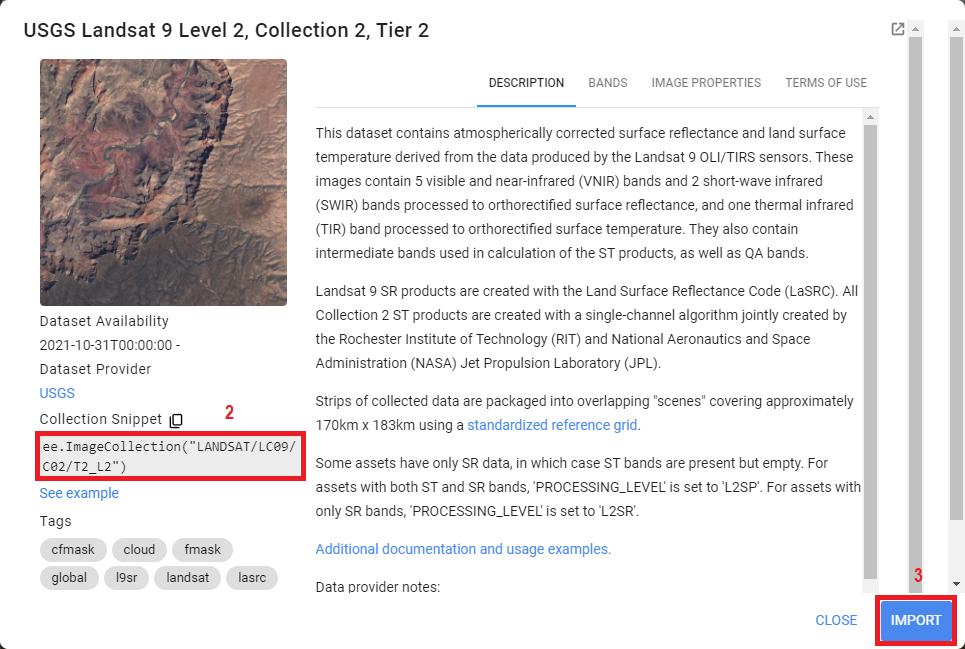 2. Vous pouvez voir une brève description de la collection d’images en cliquant sur « USGS Landsat 9 Level 2, Collection 2, Tier 2« . Ici, vous pouvez importer la collection d’images en copiant le « Collection Snippet » et en le collant dans l’éditeur de code ou en cliquant sur le bouton IMPORT dans le coin inférieur droit (Figure 43).