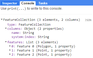 Les entités géométriques dotées d’attributs sont des objets Feature. Dans Earth Engine, une entité est déclinée sous la forme d’un fichier GeoJSON. GeoJSON est un format permettant d’encoder une variété de structures de données géographiques. Les collections d’entités sont stockées dans les objets FeatureCollection.