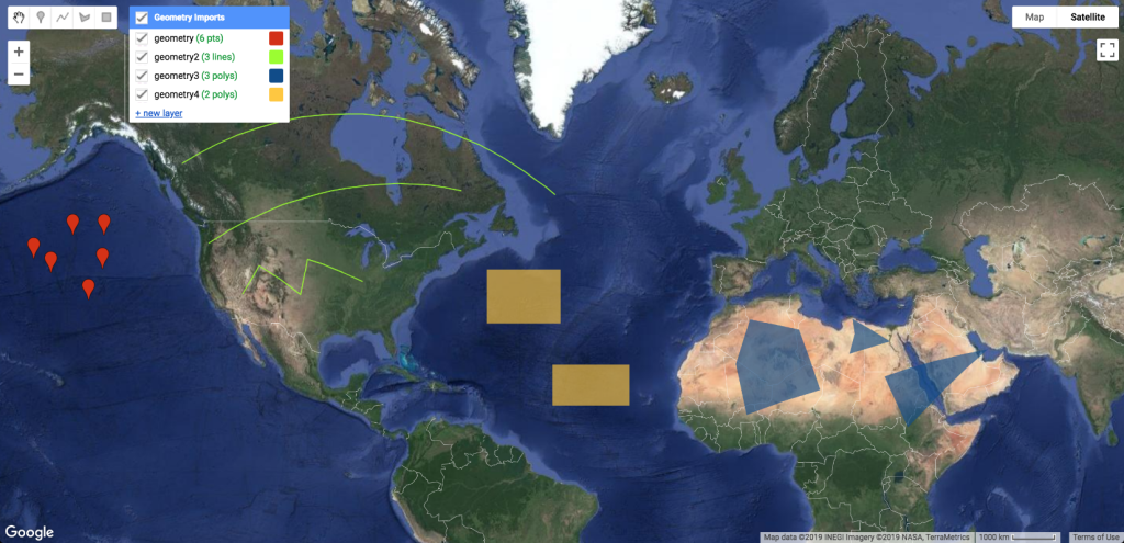 Afin d’importer des géométries dans votre script, vous pouvez les dessiner à l’écran. Pour créer des géométries, utilisez les outils de dessin de géométrie dans le coin supérieur gauche de l’affichage de la carte. Pour dessiner des points, utilisez l’icône de point de repère , pour dessiner des lignes, utilisez l’icône de ligne , pour dessiner des polygones, utilisez l’icône de polygone , pour dessiner des rectangles, utilisez l’icône de rectangle . Pour configurer les géométries importées dans votre script, cliquez sur l’icône , dans la section « Imports » de l’éditeur de code (Figure 48).