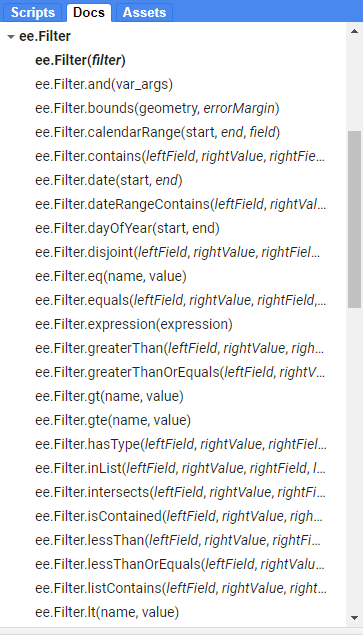 Si, dans le panneau de gauche de l’onglet « Docs », vous ouvrez le filtre ee.Filter, vous verrez de nombreux types de filtres différents que vous pouvez appliquer à vos données pour obtenir l’image que vous souhaitez (Figure 46).