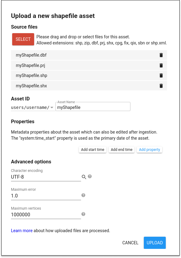 Cliquez sur le bouton « SELECT » et naviguez vers un fichier Shapefile ou une archive Zip contenant un fichier Shapefile sur votre système de fichiers local. Donnez au tableau un ID « asset » approprié (qui n’existe pas déjà) dans votre dossier utilisateur. Cliquez sur « UPLOAD » pour lancer le téléchargement.