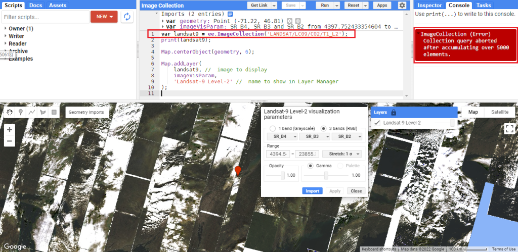 Comme vous le remarquez, la commande clé pour utiliser les collections d’images est ee.ImageCollection. Comme il est possible de le voir dans l’image précédente, il y a une erreur dans la Console causée par print(landsat9);, ce qui nous indique que GEE n’est pas en mesure de traiter plus de 5000 images simultanément. Un autre point critique est que, compte tenu de la collection massive d’images Landsat-9, il n’est pas possible de les visualiser en un seul affichage. Par conséquent, à la visualisation nous ne voyons seulement que les scènes les plus récentes prises par le satellite. Pour éviter l’erreur susmentionnée et être en mesure de traiter une grande quantité de données, nous devons réduire le nombre d’images existantes dans la collection en appliquant certains filtres.
