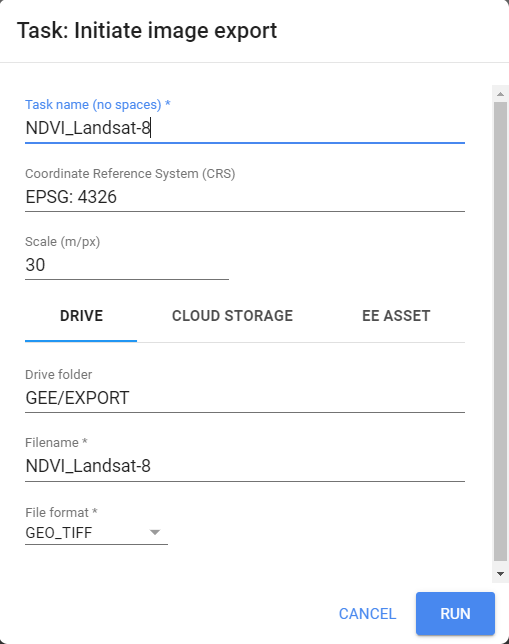 description: ‘NDVI_Landsat-8’, // le nom que vous souhaitez pour votre données sur le Drive