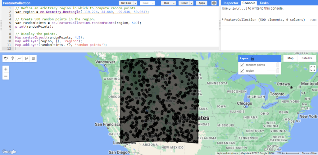 Une autre méthode utile de FeatureCollection est que vous pouvez créer une collection de points aléatoires dans une région spécifiée (Figure 51). Par exemple, cela pourrait nous être utile lorsque nous voulons rassembler des données d’entrainement pour former un algorithme d’apprentissage automatique; cela pourrait réduire considérablement le temps de préparation des données d’entraînement (nous aborderons ces sujets dans les sections suivantes).