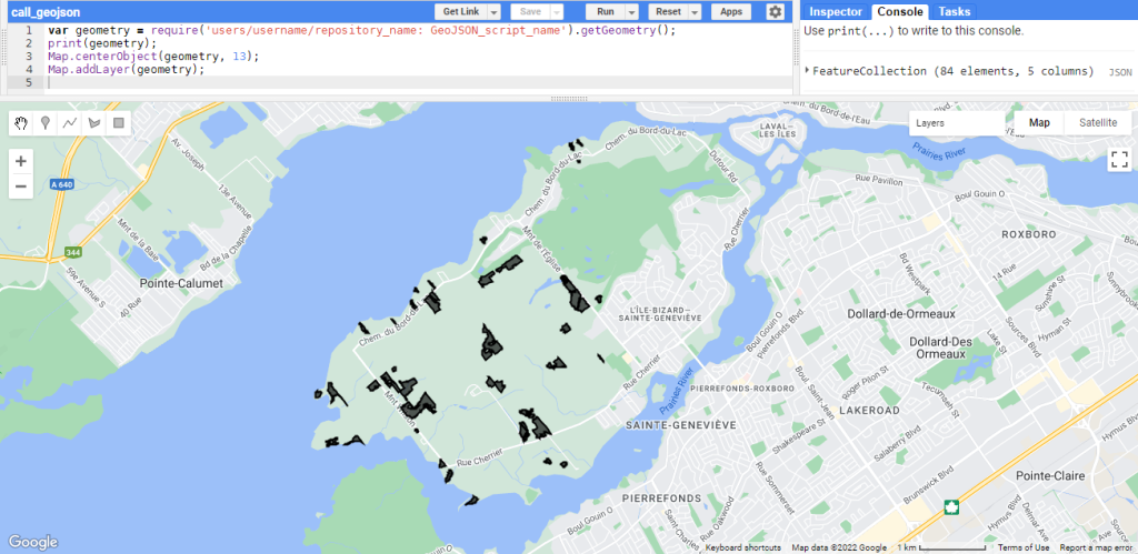 Pour la première partie, le script qui contient et analyse le fichier GeoJSON est présenté ci-dessous. Vous devez juste effacer le « // Coller la géométrie GeoJSON ici // » et coller votre fichier GeoJSON à la place.