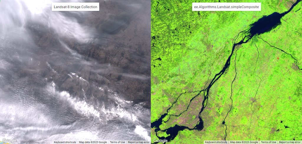 Map.addLayer(composite, viz2, ‘ee.Algorithms.Landsat.simpleComposite’);