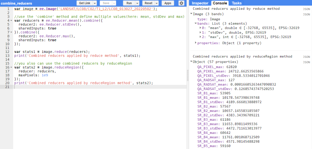 Si vous souhaitez effectuer plus d’un calcul statistique, vous devez utiliser plusieurs réducteurs imbriqués. L’exemple présenté dans la figure ci-dessous démontre comment combiner plusieurs réducteurs et les appliquer sur une image (Figure 78). Il existe une large gamme de reducer, pour en savoir plus, recherchez ee.Reducer dans « Docs ».