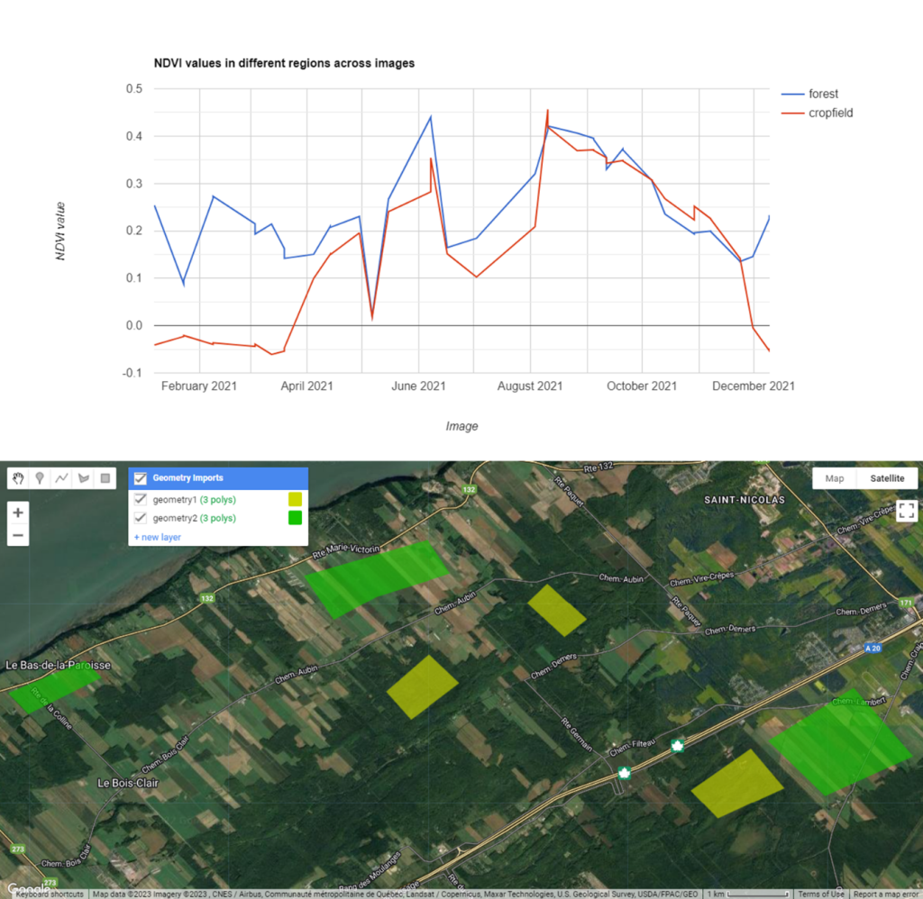Dans l’exemple suivant, nous avons une collection d’entités composée de quelques géométries définies sur des zones forestières et des terres cultivées dans le sud de la ville de Québec. Nous voulons mesurer la valeur moyenne dans ces deux classes et voir la différence NDVI dans le temps en dessinant un graphique utilisant les valeurs moyennes (Figure 81).