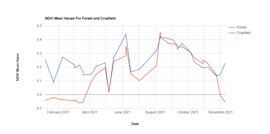 .setOptions({title: ‘NDVI Mean Values For Forest and Cropfield’, hAxis: {title: ‘Date’, titleTextStyle: {italic: false, bold: true}},