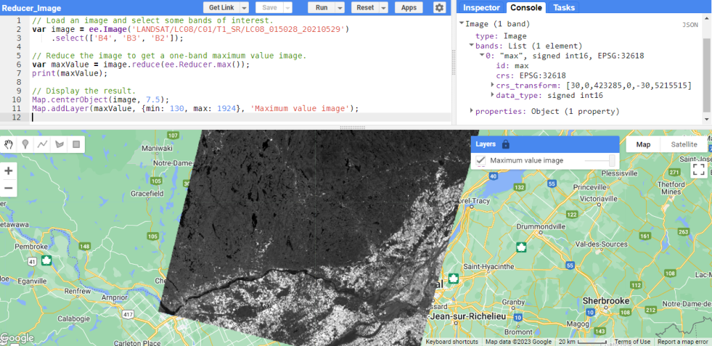 Par exemple, pour calculer le maximum pour les bandes RVB sélectionnées d’une imagerie Landsat-8, on peut utiliser le reducer. Comme on peut le remarquer dans la figure suivante (Figure 74), contrairement au cas de la collection d’images, le reducer ne renvoie qu’une bande pour les valeurs maximales des pixels parmi les trois bandes RVB.