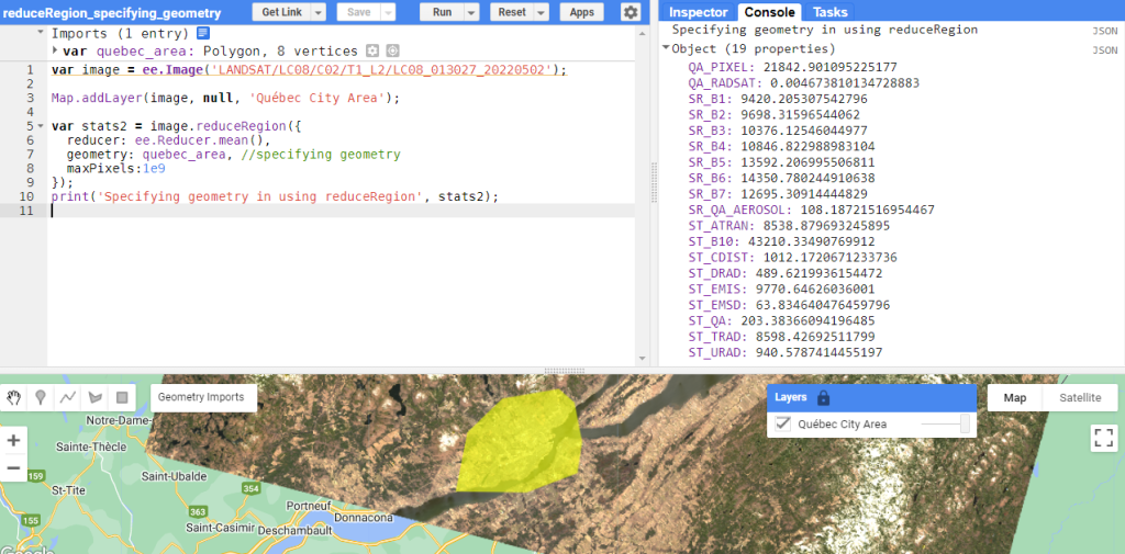 Cependant, l’utilité principale de la fonction reduceRegion est bien sur d’utiliser des géométries prédéfinies afin d’extraire des statistiques zonales propres à chacune des régions. Pour se faire, il faut ajouter un attribut « geometry » dans la fonction reduceRegion qui pointe vers la featureCollection d’intérêt (Figure 77).