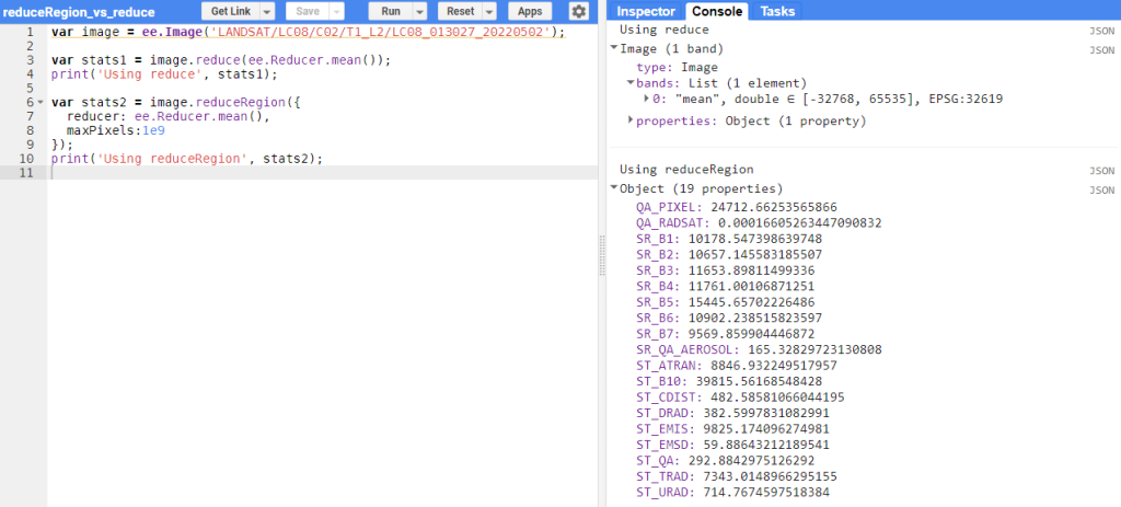 L’application du reducer sur des images n’est pas différente des collections d’images, sauf que les bandes de l’image sont en entrée du reducer plutôt que les images de la collection. La sortie est également une image dont le nombre de bandes est égal au nombre de sorties du reducer.